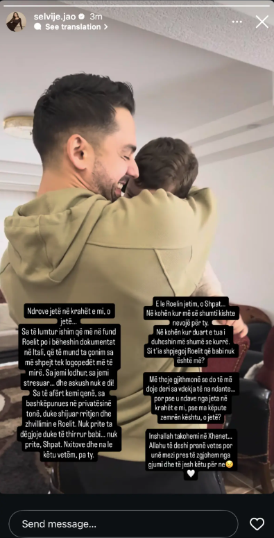 “Ndrove jetë në krahët e mi, o jetë… Sa të lumtur ishim që më në fund Roelit po i bëheshin dokumentat në Itali, që të mund ta gëzonim sa më shpejt tek logopedët më të mirë,” shkruan ajo, duke theksuar lodhjen dhe stresin që kishin kaluar për të arritur këtë moment.