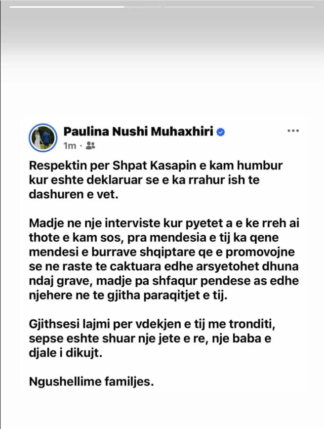 Gazetarja dhe panelistja e emisionit “Zanat”, Paulina Nushi, ka reaguar dje pas lajmit të ndarjes nga jeta të këngëtarit Shpat Kasapi.