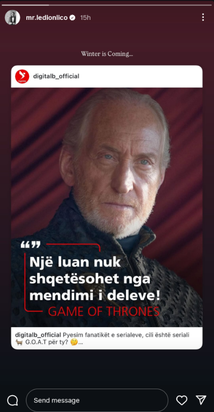 Për t’i dhënë fund aludimeve, Ledioni ka postuar në InstaStory thënien e njohur nga “Game of Thrones”: “Një luan nuk shqetësohet nga mendimi i deleve!” Ai e shoqëroi këtë citim me frazën: “Winter is Coming…” (Dimri po vjen…), e cila u interpretua edhe si paralajmërim për nisjen e edicionit të pestë të formatit.