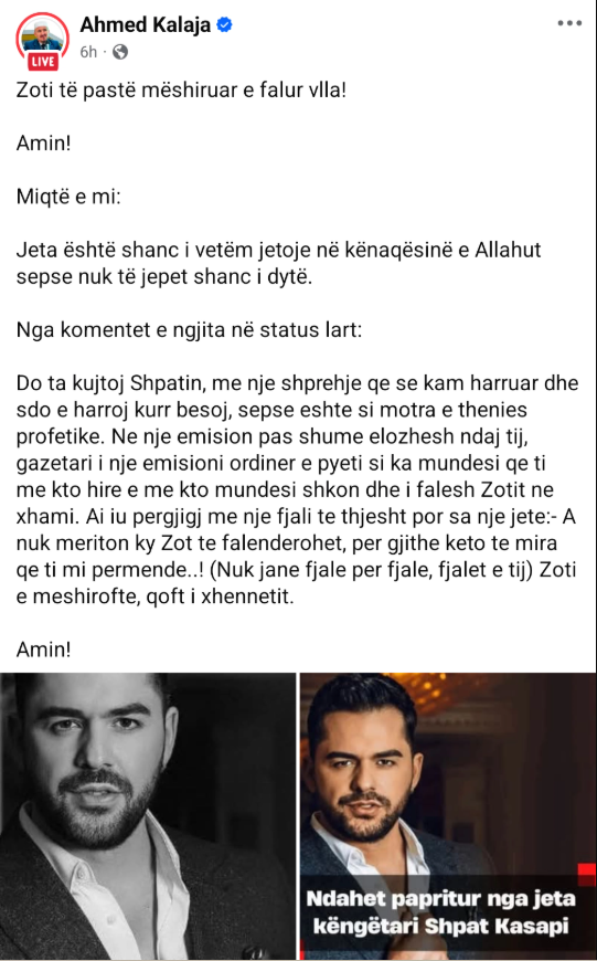 Imami i xhamisë së “Dine Hoxhës” në Tiranë, Ahmed Kalaja, ka bërë një dedikim prekës, duke sjellë në vëmendje anën e fortë shpirtërore të artistit.