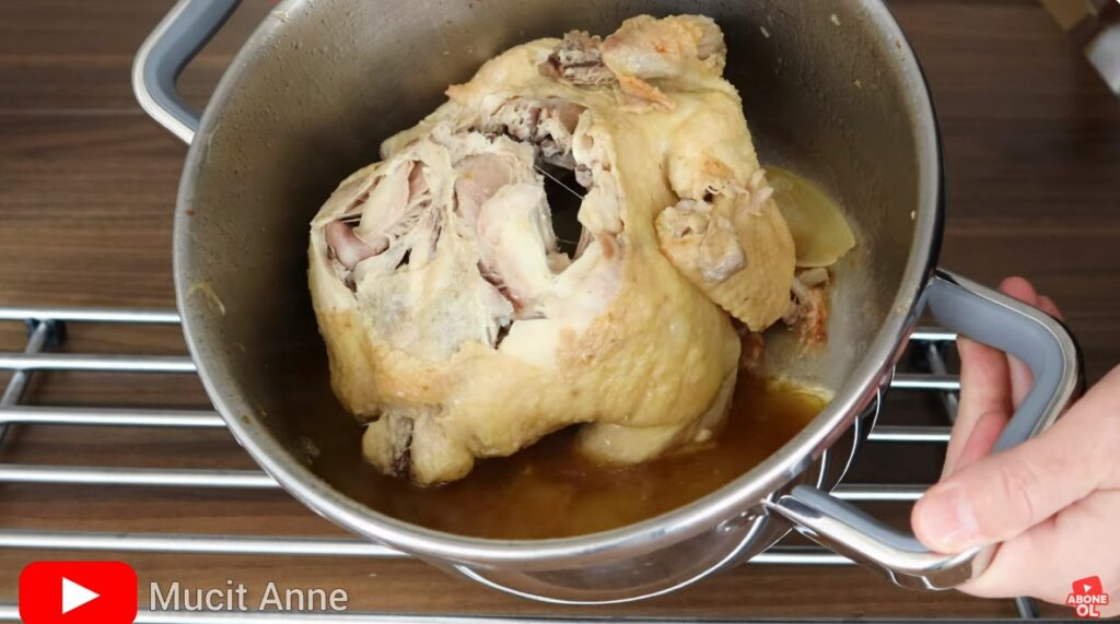 Tavuğun suyunu süzelim ve tavuğu biraz daha pişirip kızartalım.
