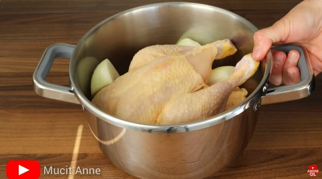 Düdüklü tencerenin içerisine bütün tavuk ve 4 parçaya bölünmüş soğanı ekleyelim.